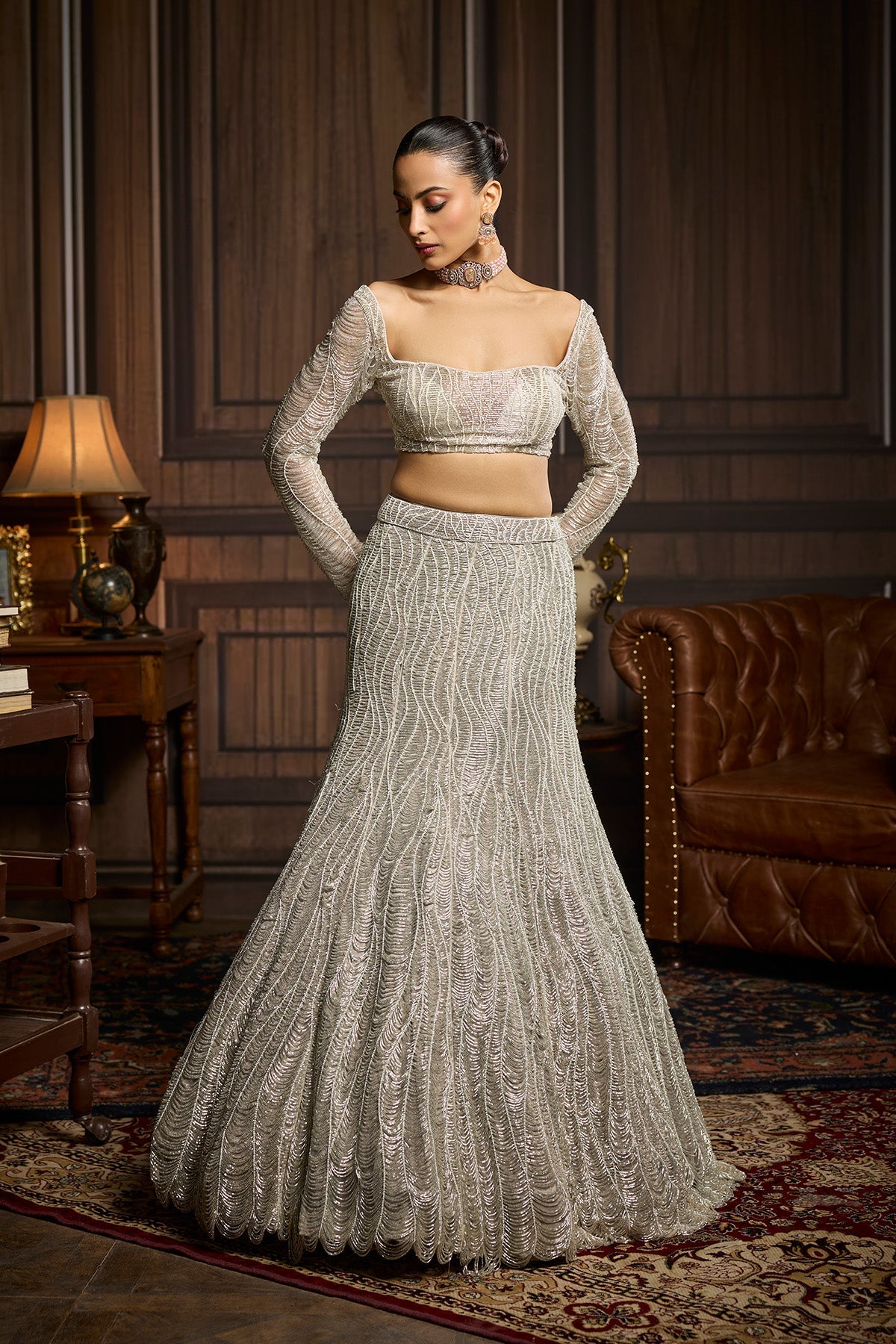 Light Gold Embellished Blouse And Highlighted Lehenga Set