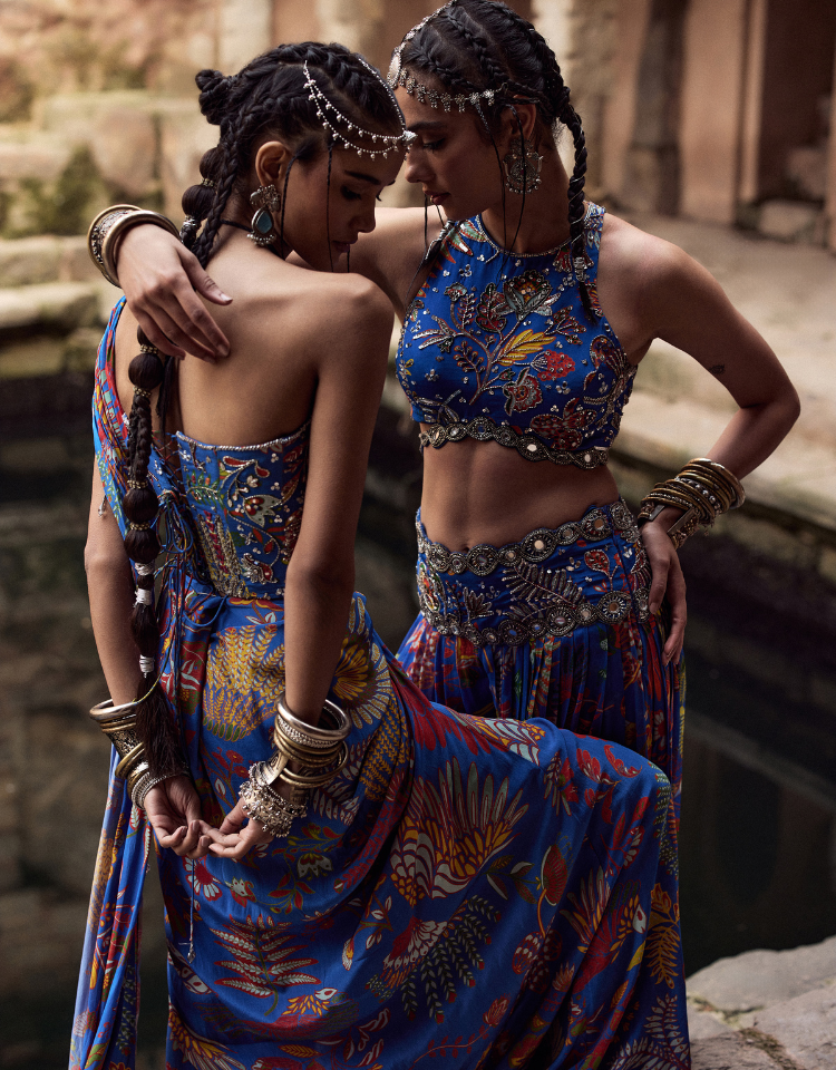 Electric Blue Printed And Highlighted Corset Dhoti Skirt Saree Set